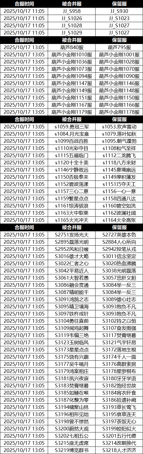 *清单中仅列出主服,若往期有被合并入该区的服,则将一并进行合服。